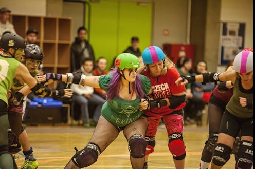 Players wear four-wheeled “quad” roller skates and mandatory protective equipment, including a helmet, mouth and wrist guards and elbow and knee pads – but foot injuries are common. These often include bruising, torn ligaments, broken bones and toenail injuries – like the one featured in the image below.
